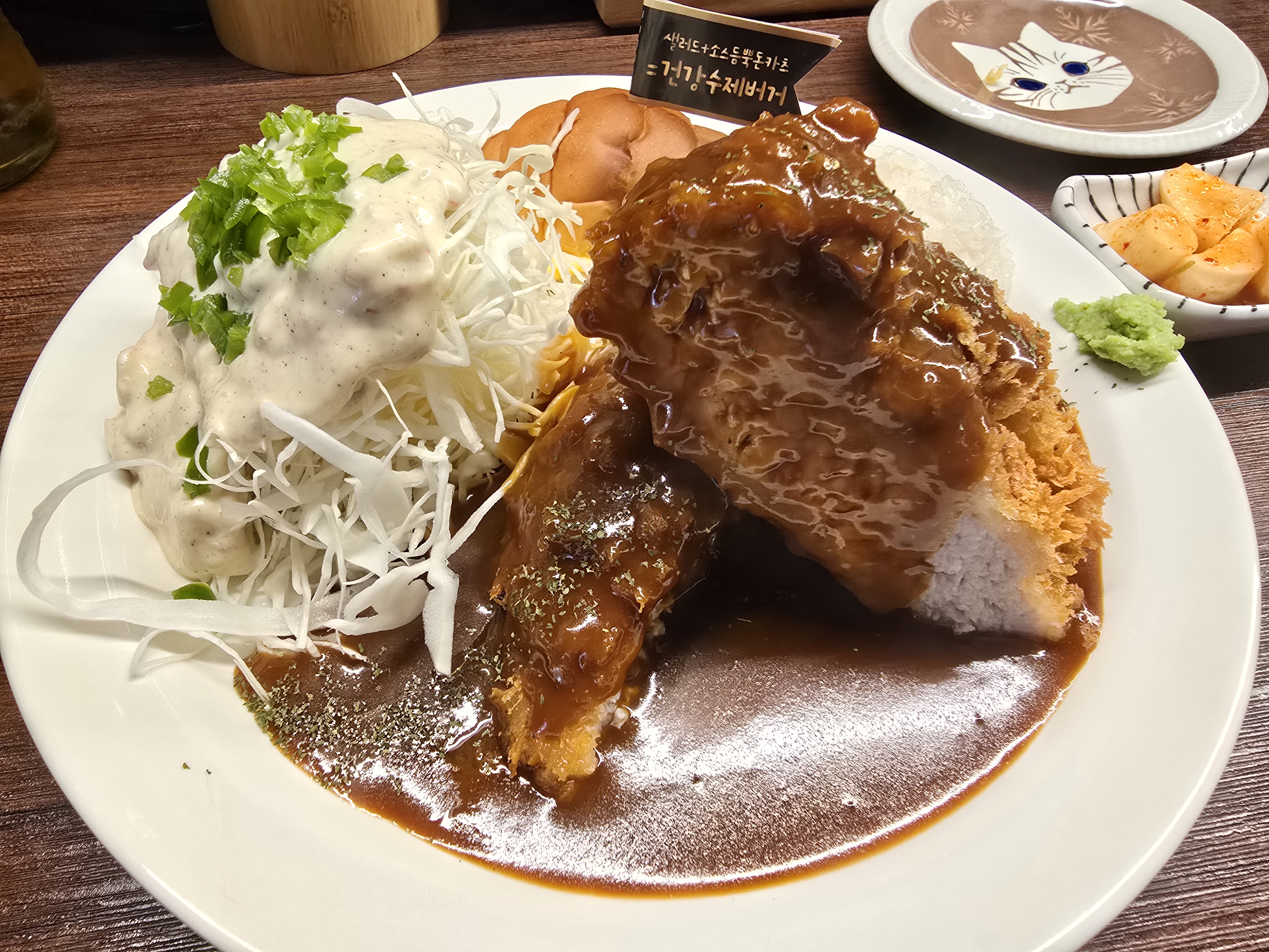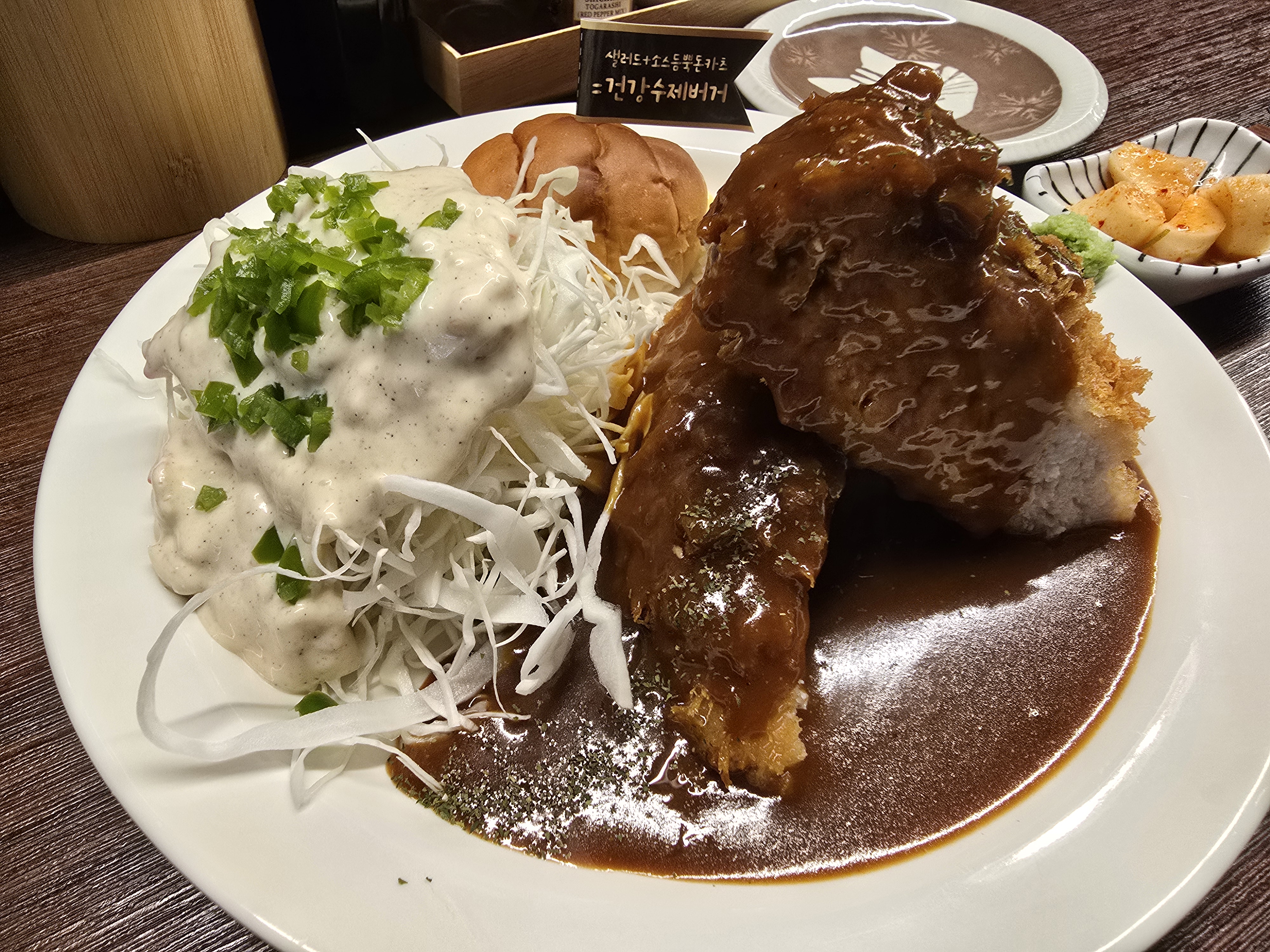 돈가스 등장했습니다. 아주 두툼하고 샐러드도 충분하게 나옵니다.